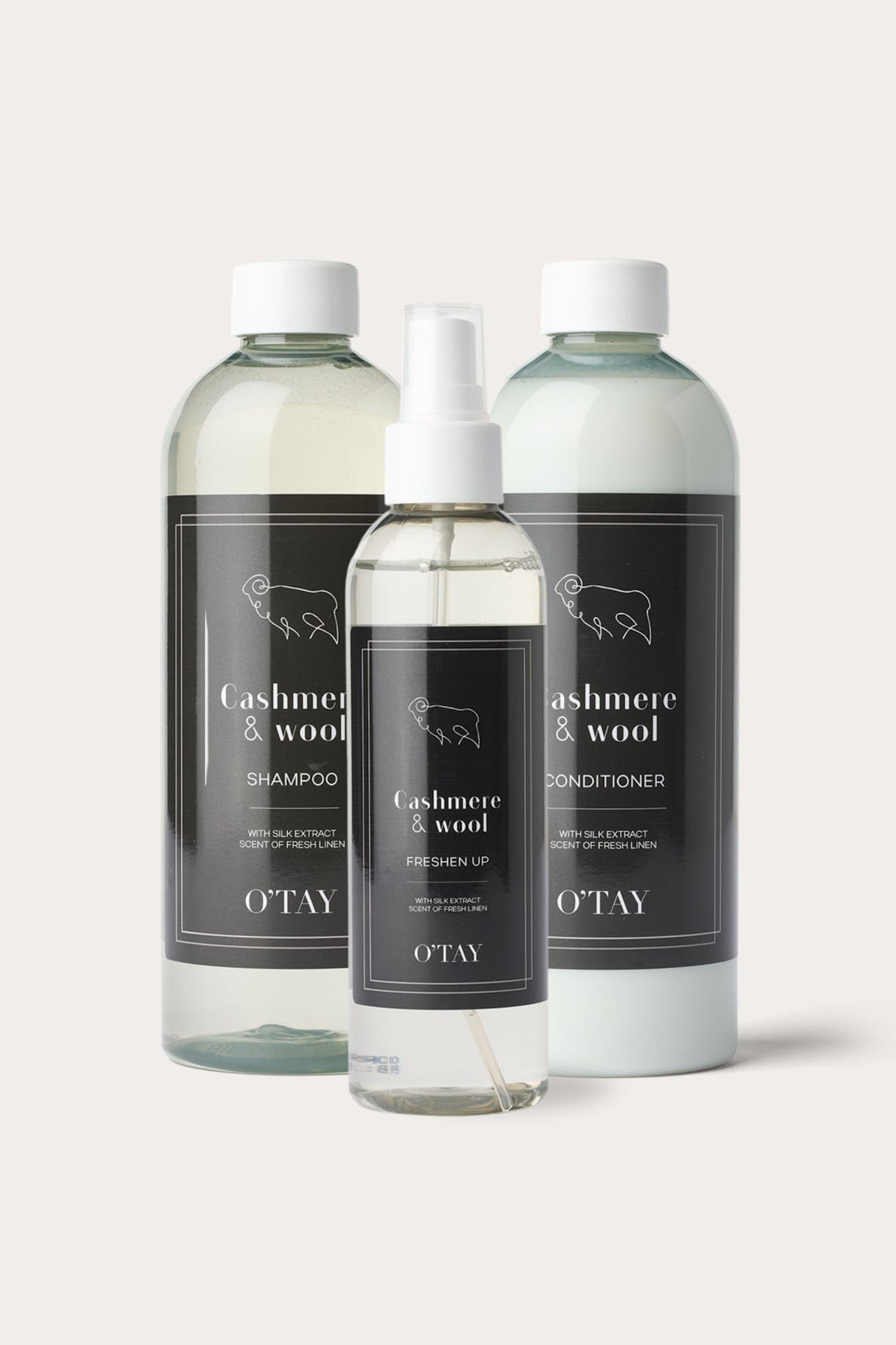 Experience the ultimate luxury care for your cashmere and wool products with the O'TAY Care Set - Big. This complete set includes Cashmere Shampoo, Cashmere Conditioner, and Freshen Up Spray – everything you need to keep your favorite knits soft, fragrant, and well-cared for. The shampoo gently cleanses, the conditioner restores the fibers’ natural softness, and the Freshen Up Spray gives your garments an instant fresh boost between washes. The perfect set for giving your luxury materials the very best treatment.