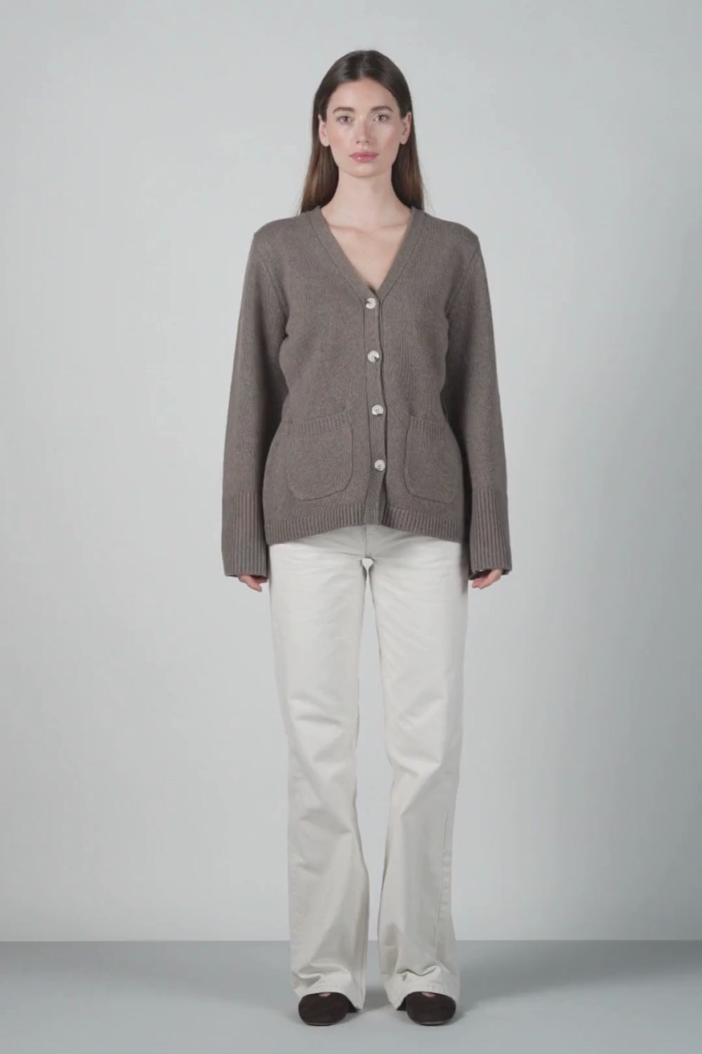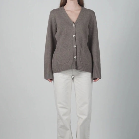 Kaitlyn Cardigan is made from an exclusive and thick wool blend of 30% cashmere and 70% wool. It features an elegant V-neckline and front pockets. The oversized sleeves with wide ribbed cuffs create a modern look, while the tailored fit ensures a feminine and sophisticated appearance, making the cardigan perfect for both casual and more formal occasions.