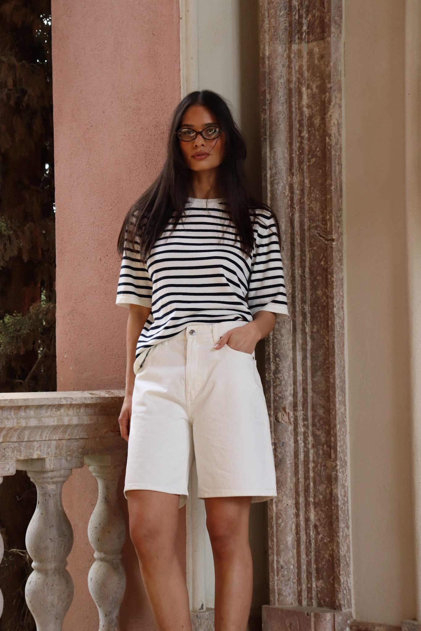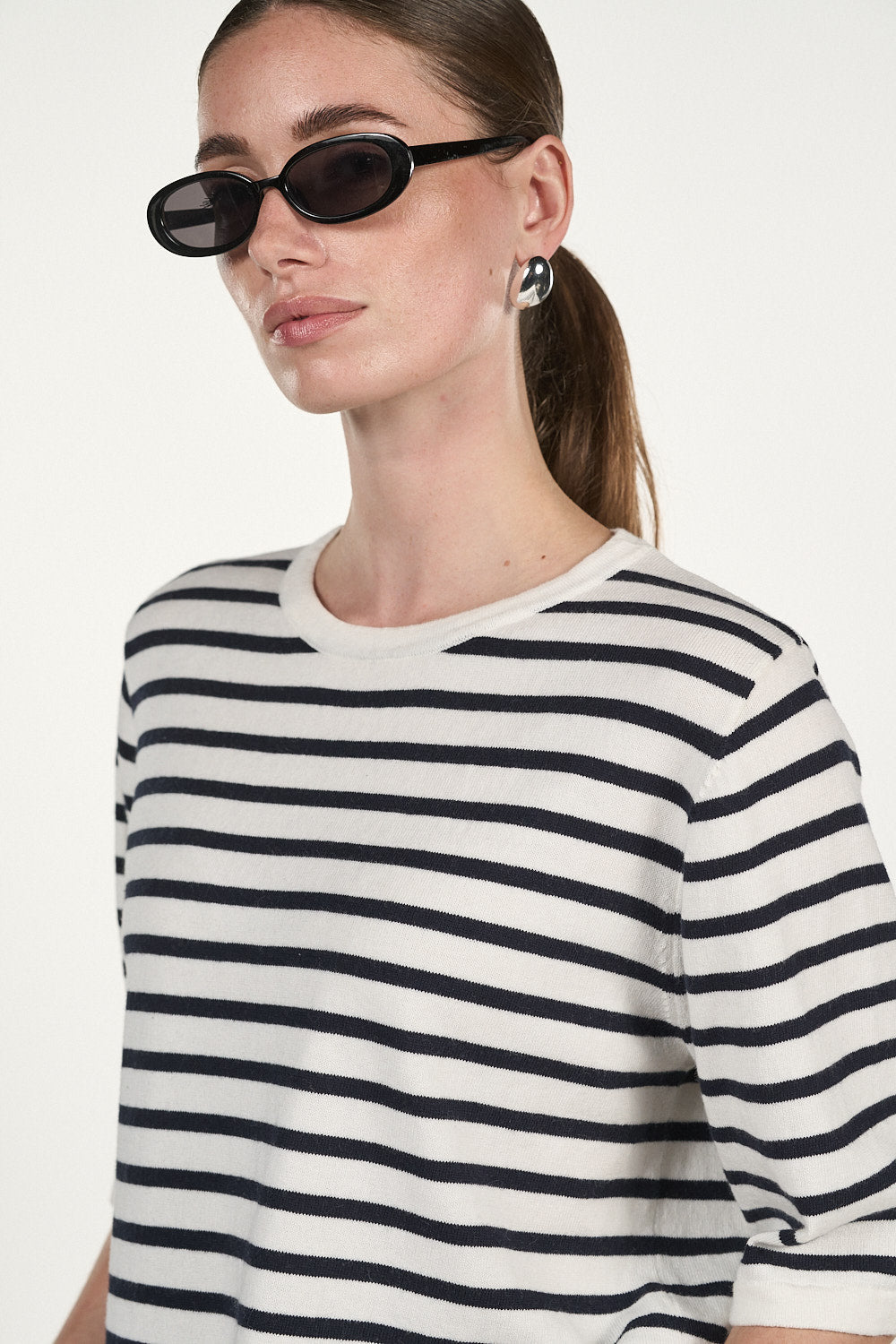 Go through the summer with our lovely Gurli T-shirt. The thin knit with its beautiful white and navy stripes consists of 5% cashmere and 95% cotton. With slightly longer t-shirt sleeves and an elegant fit, it's perfect for warm days. Get into the summer mood with our Gurli T-shirt by pairing it with our Galina Pants or a pair of denim shorts for a more relaxed look.