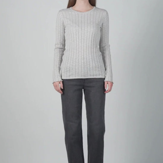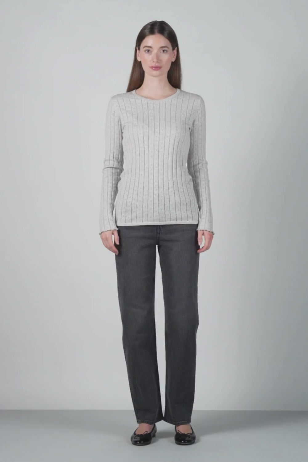 Kristin is the perfect basic blouse that fits into any wardrobe. The wavy edges and pointelle details give this essential blouse a simple yet feminine look. The cashmere and cotton blend makes it soft and comfortable to wear.