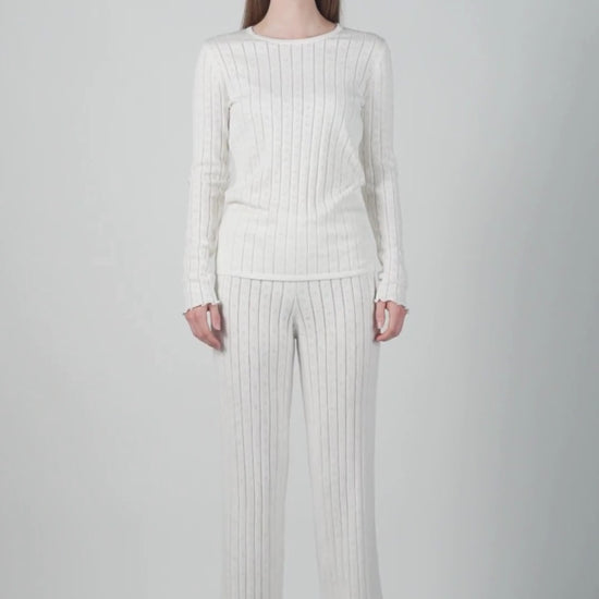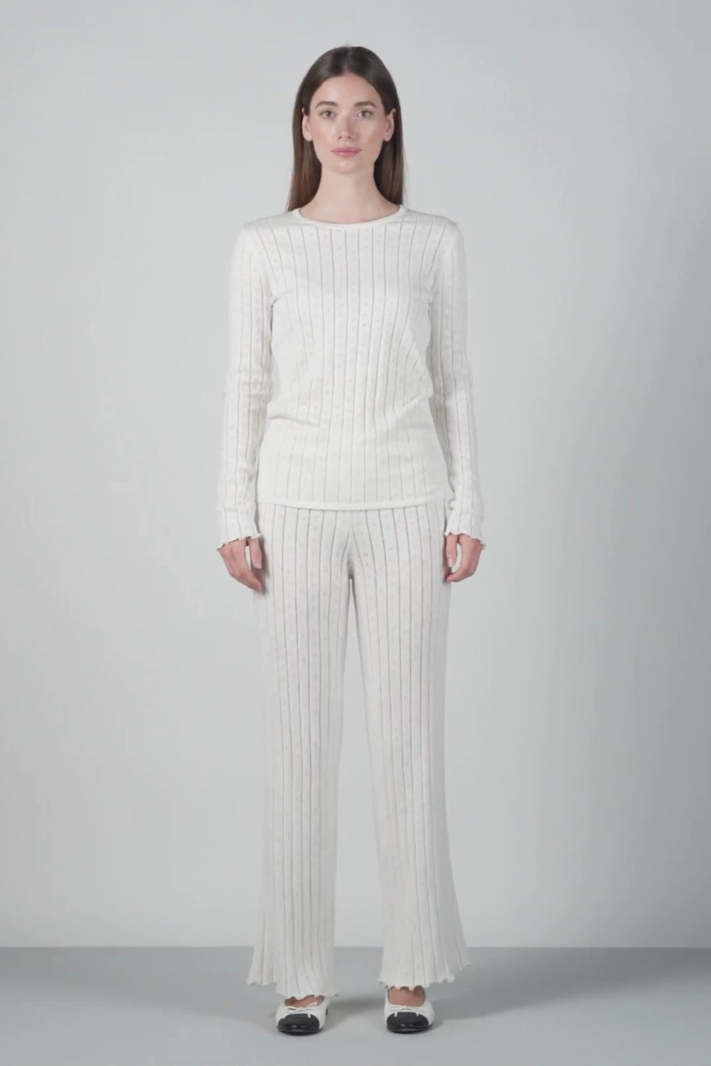 Kristin is the perfect basic blouse that fits into any wardrobe. The wavy edges and pointelle details give this essential blouse a simple yet feminine look. The cashmere and cotton blend makes it soft and comfortable to wear.
