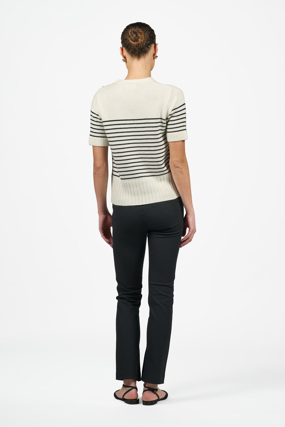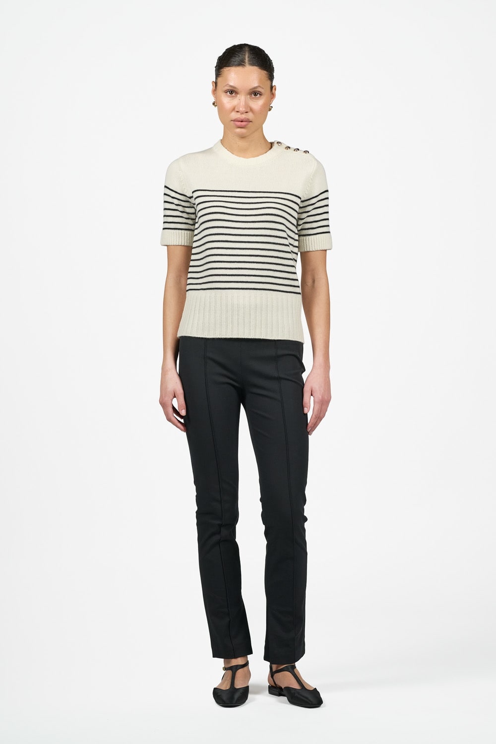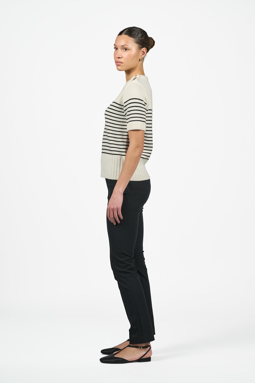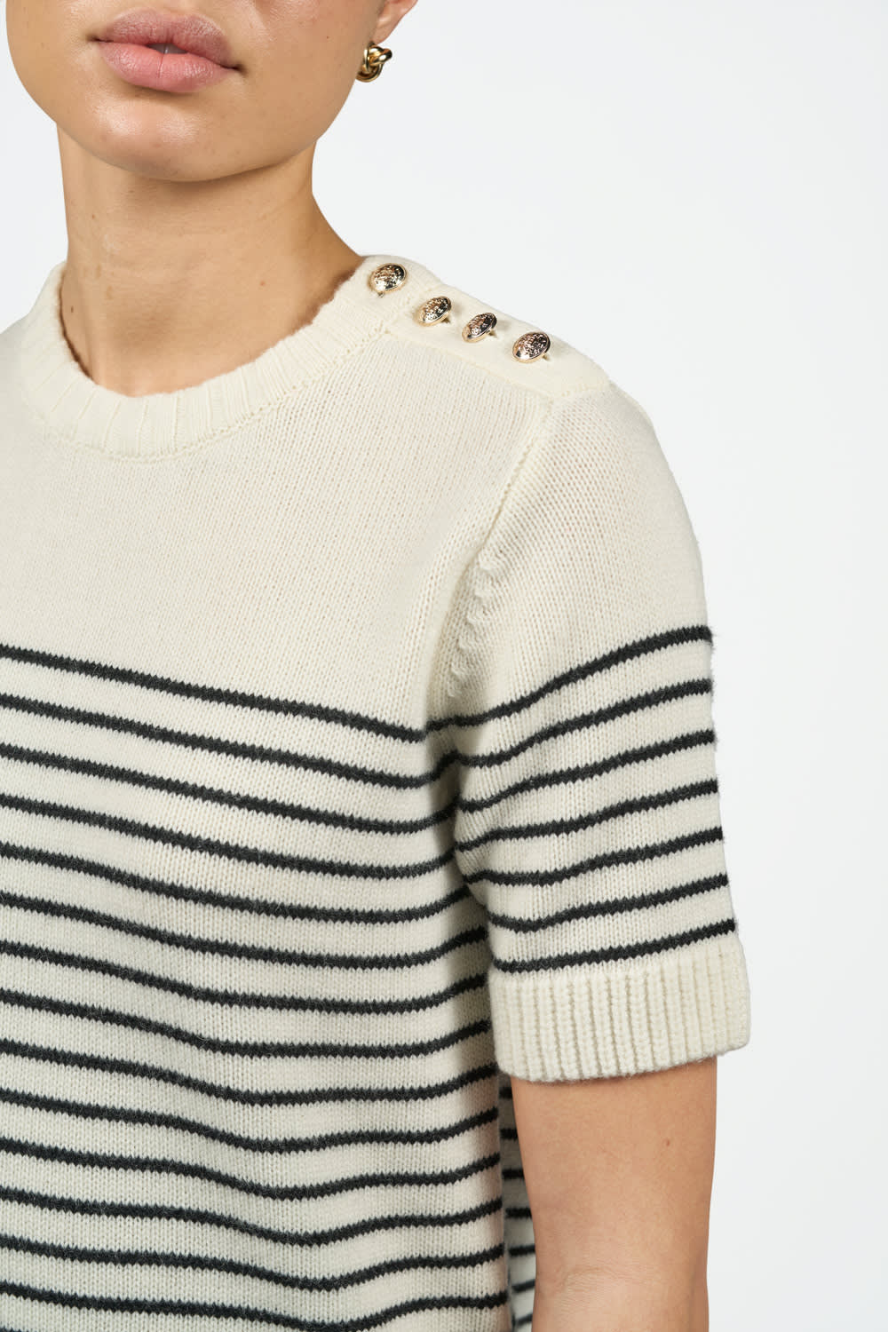 Lady T-shirt is a luxurious piece made from 30% cashmere and 70% wool, offering a soft and comfortable feel against the skin. The beautiful Off White color with narrow black stripes creates a classic look. Fine details such as wide ribbed edges and gold buttons on one shoulder add a sophisticated and modern touch. Perfect for both casual and more formal occasions where you want to combine comfort with style.