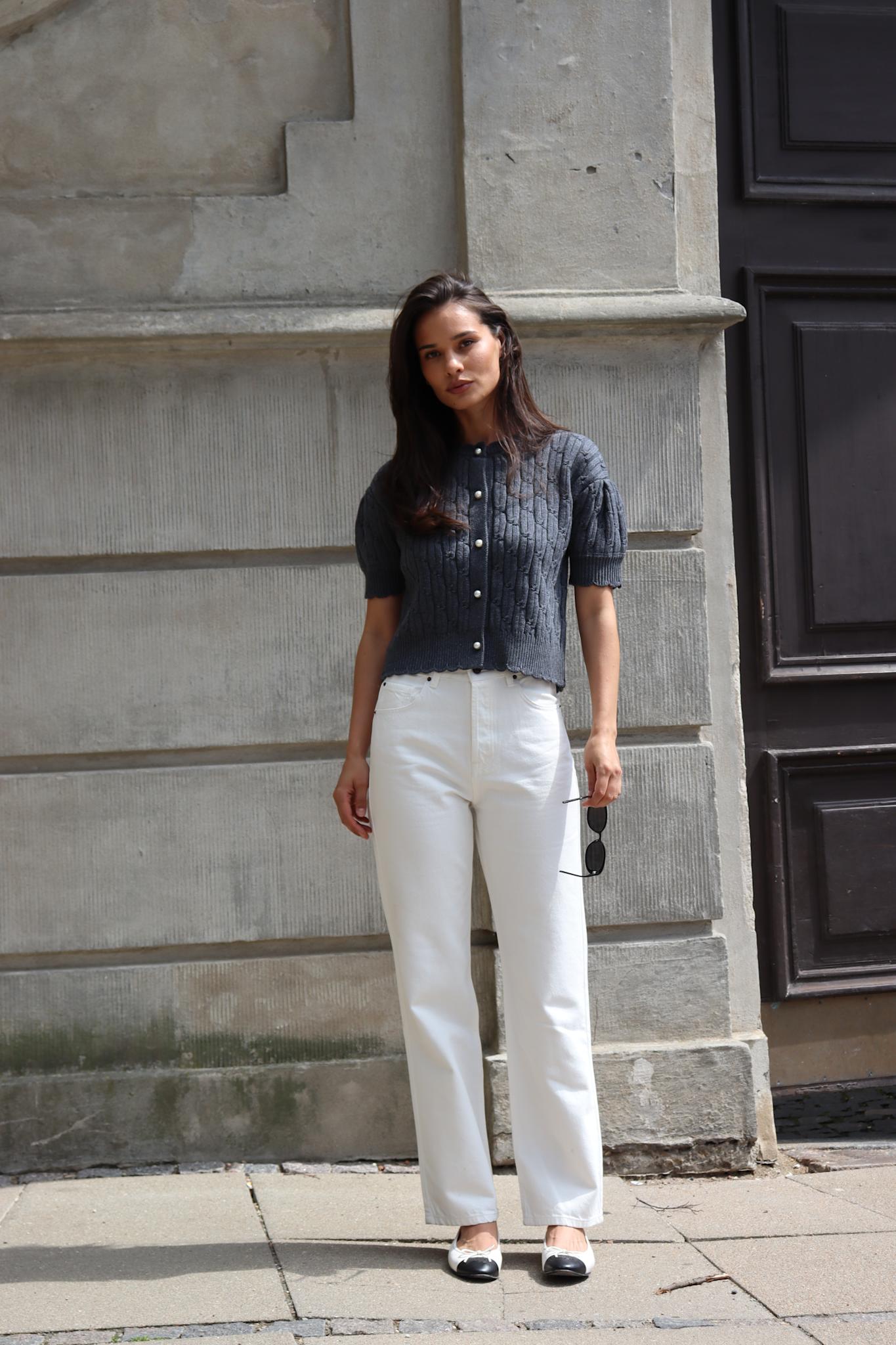 Noabelle is a beautiful and feminine short-sleeved cardigan, knitted in 100% wool. The thick and structured quality makes it ideal as a warm layering piece during transitional seasons. The cardigan features an elegant wavy ribbed trim at the neckline, sleeve ends, and hem, adding softness and a feminine touch to the firm knit. The subtle texture in the fabric creates a delicate pattern that gives the cardigan character and style. Noabelle Cardigan is fastened with fine pearl buttons that complete the sophisticated look. Wear it over a dress, with jeans, or as a light alternative to a blazer.